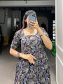 Load image into Gallery viewer, Navy Blue Rayon Dresses With Price and Online Shopping Price Under 1000 . this Fabric Soft and Square Neck and Shop this stitched Rayon frock with a vibrant Printed and Foils Work , 4-meter flair, and micro cotton lining. Adjustable chest up to 47 inches for a perfect fit.